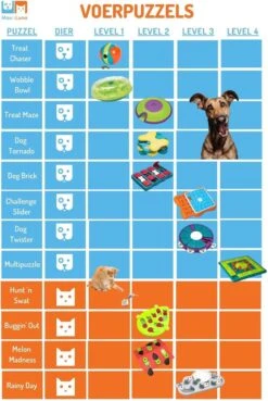 GEBRUIK: Laat je huisdier eerst gaan zitten en toon hem dat je in de vier draaiende lagen brokjes verstopt. Pas nadat je een teken geeft mag je huisdier beginnen. Met zijn snuit kan hij de draaiende schijven opzij duwen om bij het lekkers te komen. Gaat het te wild, stop dan en begin opnieuw. Gaat het goed dan kan het spel moeilijker gemaakt worden door de draaiende schijven met de bijgeleverde botjes te blokkeren. Zoals altijd mag je helpen, maar met de Dog Tornado zal je huisdier zich snel zelf weten te redden! De Dog Tornado kan zowel binnen- als buitenshuis gebruikt worden. Het spel is bedoeld om samen te spelen en niet om je huisdier alleen mee te laten. Berg na afloop het spel altijd op voor de volgende keer.
