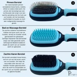 - Pinnen Borstel: De roestvrijstalen pinnen verwijderen losse haren, matten, klitten en dode onder vacht. De pinnen zijn bevestigd aan een luchtkussen dat zorgt voor een zachte aanraking met de huid van uw huisdier om het borstelen comfortabel te houden en toch een rustgevende massage te geven.