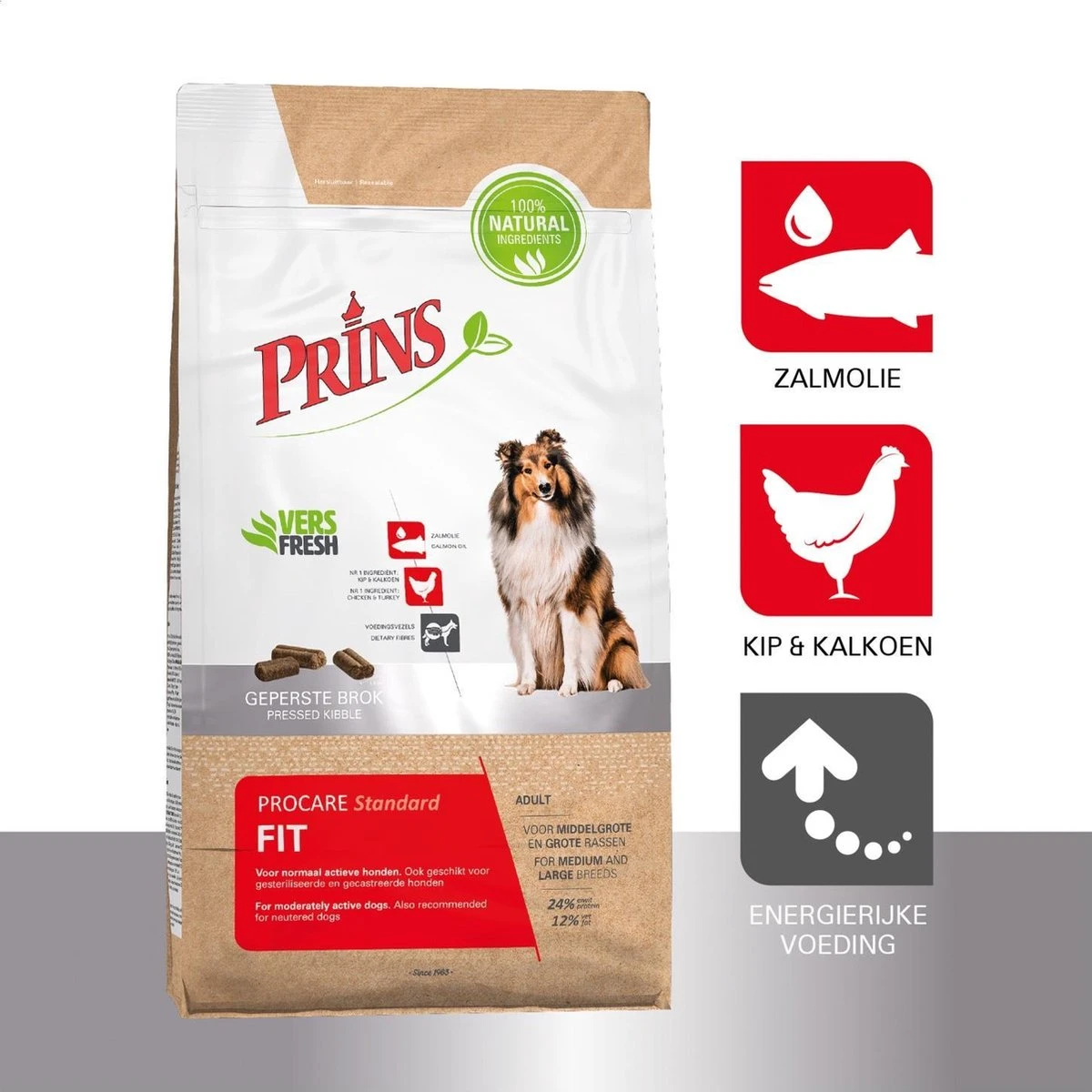 ProCare Standaard-Fit is een ideale voeding voor de volwassen hond met een gemiddeld energieverbruik. Dankzij een aangepast energiegehalte helpt deze voeding de hond in optimale conditie te blijven. Hoogwaardige ingrediënten als zalmolie en FOS (fructo-oligo-sacchariden) zorgen voor een gezonde voeding die bijdraagt aan een gezonde huid en vacht, een optimale vertering en een evenwichtige darmflora.