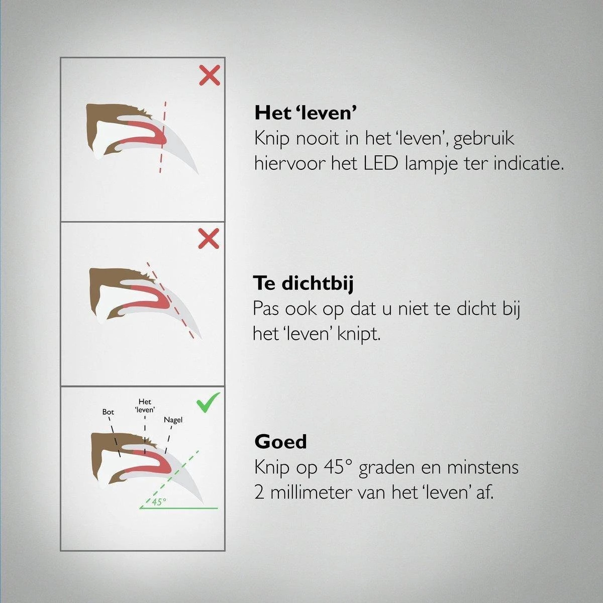 Het geïntegreerde LED-licht zit handig verwerkt in het design. Door middel van de LED-verlichting in de nagelknipper verlicht de bloedlijn in de nagels van uw huisdier, waardoor het een gemakkelijke en veilige manier van gebruiken is.